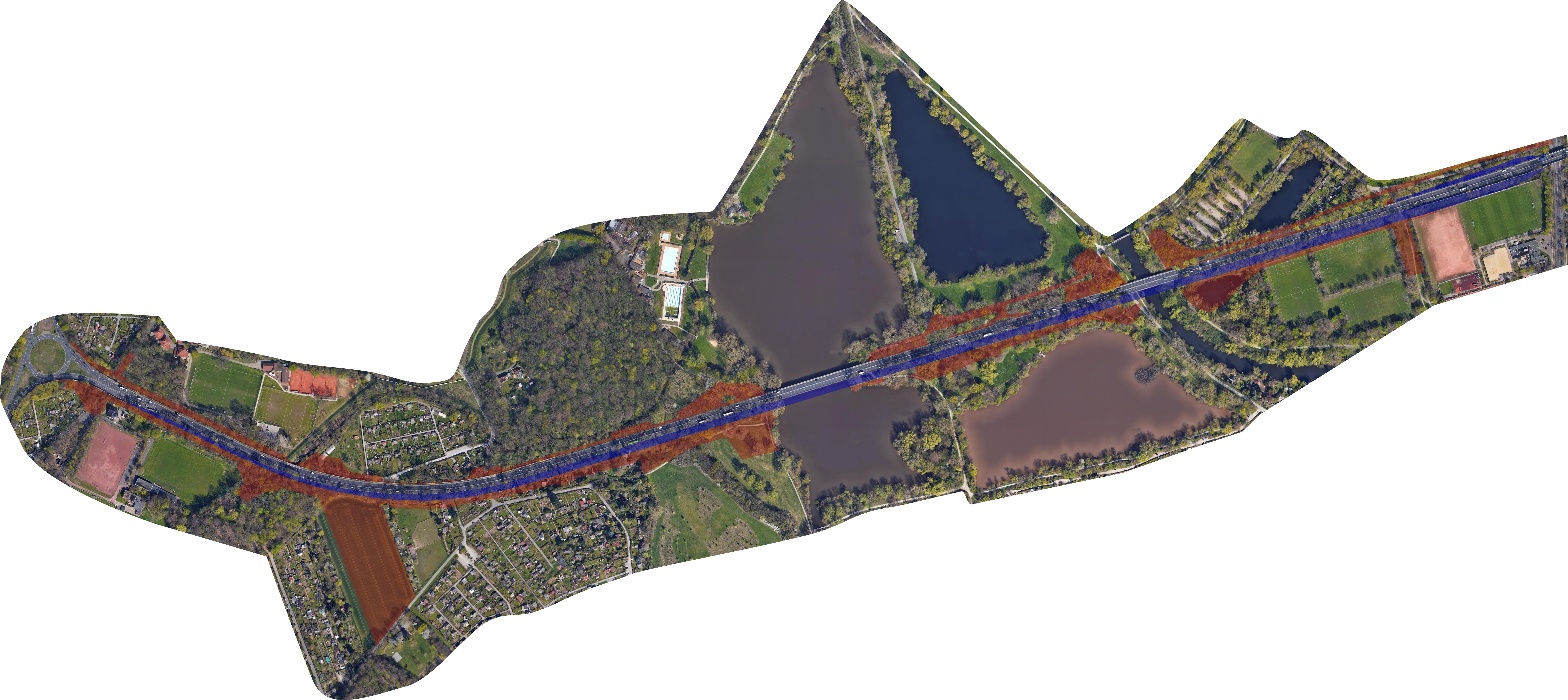 Die komplette Rodungskarte (in hoher Auflösung, png, 16 MB) legt die Flächen, die laut Planfeststellungsbeschluss gerodet werden müssten, über das Luftbild des Gebiets; blau: Fahrbahnerweiterung, rot: Baustraßen und Baustelleneinrichtungsflächen.